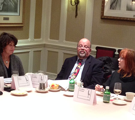 | Guests and member convened today at the Friars club to hear energy adviser Charles Goulding (Energy Tax Savers) below flanked by our GC Sherry Rivera (Envirron) and new Green but long-time Gotham member Geraldine Newman (NEWTHYNK). |
